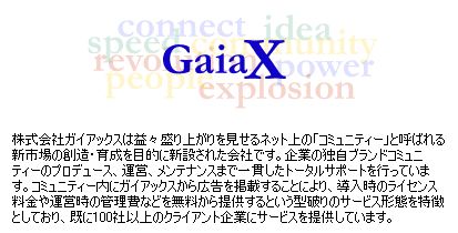 http://www.gaiax.com/*ご希望のお客様に限り、お客様の大切なデータ(日記、掲示板)を「gaiax」に 移行することも可能です。 詳細は今年度9月に「gaiax」に記載させていただきますのでご確認お願い致します。 (データ移行システムは、gaiaxユーザー様に9月頃に提供される予定です。)